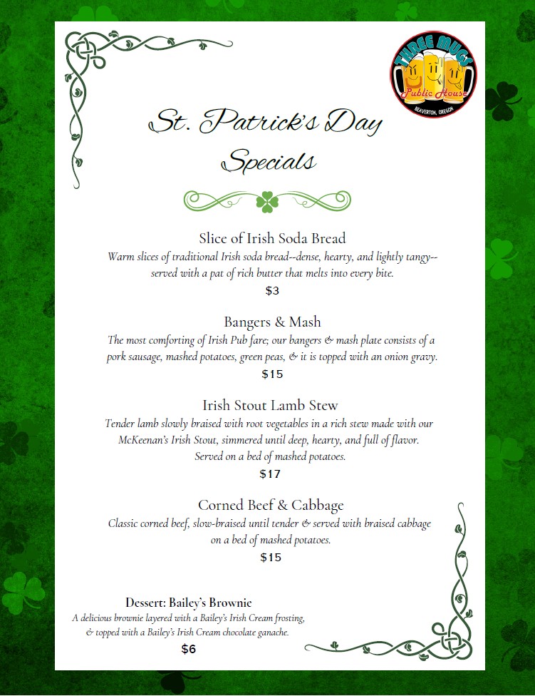We will have beer releases, such as a green beer for the partygoers & a traditional Cask Ale for the beer aficionados. We will have food and drink specials all four days. Our special menu will include Lamb Stew, Corned Beef & Cabbage, Bangers & Mash, & Traditional Irish Soda Bread! You will also be able to enter to win our “Pot o’ Gold Raffle,” which features gift cards and a few other fun surprises. The winner will be drawn on Tuesday.